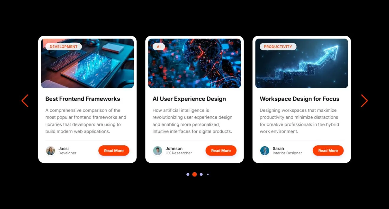 <!DOCTYPE html> <!-- Coding By Abhikesh - www.abhikesh.com --> <html lang="en"> <head> <meta charset="UTF-8" /> <meta name="viewport" content="width=device-width, initial-scale=1.0" /> <title>Card Slider HTML & CSS | Abhikesh</title> <!-- Linking Swiper CSS --> <link rel="stylesheet" href="https://cdn.jsdelivr.net/npm/swiper@11/swiper-bundle.min.css" /> <link rel="stylesheet" href="style.css" /> </head> <body> <div class="container swiper"> <div class="wrapper"> <div class="card-list swiper-wrapper"> <!-- Single Card --> <div class="card swiper-slide"> <div class="card-image"> <img src="images/design.jpg" alt="Design Trends" /> <div class="card-tag">Design</div> </div> <div class="card-content"> <h3 class="card-title">Modern UI Trends for 2025</h3> <p class="card-text">Explore the latest user interface design trends that are shaping the digital landscape this year. From neumorphism to glassmorphism and beyond.</p> <div class="card-footer"> <div class="card-profile"> <img src="images/user-1.jpg" alt="Alex Smith" /> <div class="card-profile-info"> <span class="card-profile-name">Smith</span> <span class="card-profile-role">UI Designer</span> </div> </div> <a href="#" class="card-button">Read More</a> </div> </div> </div> <!-- Single Card --> <div class="card swiper-slide"> <div class="card-image"> <img src="images/development.jpg" alt="Development" /> <div class="card-tag">Development</div> </div> <div class="card-content"> <h3 class="card-title">Best Frontend Frameworks</h3> <p class="card-text">A comprehensive comparison of the most popular frontend frameworks and libraries that developers are using to build modern web applications.</p> <div class="card-footer"> <div class="card-profile"> <img src="images/user-2.jpg" alt="Jessica Chen" /> <div class="card-profile-info"> <span class="card-profile-name">Jassi</span> <span class="card-profile-role">Developer</span> </div> </div> <a href="#" class="card-button">Read More</a> </div> </div> </div> <!-- Single Card --> <div class="card swiper-slide"> <div class="card-image"> <img src="images/ai.jpg" alt="AI" /> <div class="card-tag">AI</div> </div> <div class="card-content"> <h3 class="card-title">AI User Experience Design</h3> <p class="card-text">How artificial intelligence is revolutionizing user experience design and enabling more personalized, intuitive interfaces for digital products.</p> <div class="card-footer"> <div class="card-profile"> <img src="images/user-3.jpg" alt="Marcus Johnson" /> <div class="card-profile-info"> <span class="card-profile-name">Johnson</span> <span class="card-profile-role">UX Researcher</span> </div> </div> <a href="#" class="card-button">Read More</a> </div> </div> </div> <!-- Single Card --> <div class="card swiper-slide"> <div class="card-image"> <img src="images/productivity.jpg" alt="Productivity" /> <div class="card-tag">Productivity</div> </div> <div class="card-content"> <h3 class="card-title">Workspace Design for Focus</h3> <p class="card-text">Designing workspaces that maximize productivity and minimize distractions for creative professionals in the hybrid work environment.</p> <div class="card-footer"> <div class="card-profile"> <img src="images/user-4.jpg" alt="Sarah Miller" /> <div class="card-profile-info"> <span class="card-profile-name">Sarah</span> <span class="card-profile-role">Interior Designer</span> </div> </div> <a href="#" class="card-button">Read More</a> </div> </div> </div> <!-- Single Card --> <div class="card swiper-slide"> <div class="card-image"> <img src="images/animation.jpg" alt="Animation" /> <div class="card-tag">Animation</div> </div> <div class="card-content"> <h3 class="card-title">Micro Animation Designs</h3> <p class="card-text">The small animations and interactions that make a big difference in user experience and how to implement them effectively in your designs.</p> <div class="card-footer"> <div class="card-profile"> <img src="images/user-5.jpg" alt="David Park" /> <div class="card-profile-info"> <span class="card-profile-name">David</span> <span class="card-profile-role">Motion Designer</span> </div> </div> <a href="#" class="card-button">Read More</a> </div> </div> </div> </div> <!-- Pagination --> <div class="swiper-pagination"></div> <!-- Navigation Buttons --> <div class="swiper-slide-button swiper-button-prev"></div> <div class="swiper-slide-button swiper-button-next"></div> </div> </div> <!-- Linking Swiper script --> <script src="https://cdn.jsdelivr.net/npm/swiper@11/swiper-bundle.min.js"></script> <!-- Custom Script --> <script src="script.js"></script> </body> </html>