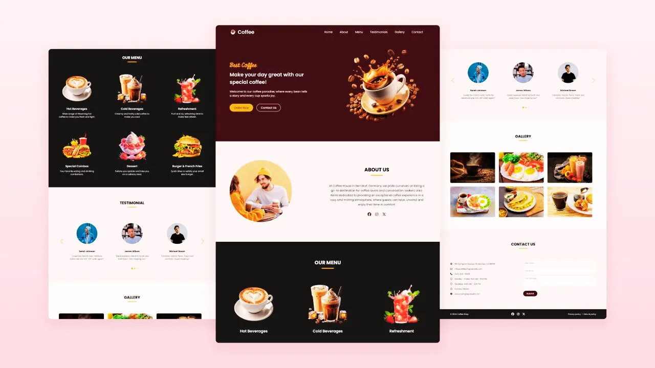 In this blog post, we’ll guide you through constructing a fully responsive, coffee-themed website using only HTML, CSS, and JavaScript. The site will feature key sections such as Home, About, Menu, Testimonials, Gallery, Contact, and a Footer. It will not only be visually appealing but also function seamlessly across all devices, from mobile to desktop.