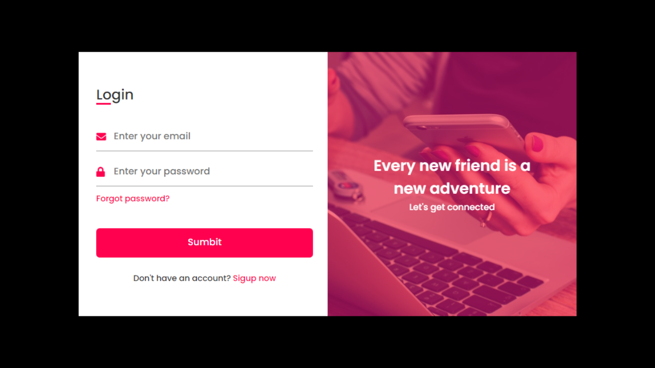 <!DOCTYPE html><!-- Created by abhikesh |www.abhikesh.com--><html lang="en" dir="ltr"><head><meta charset="UTF-8"><title> Login and Registration Form in HTML & CSS | abhikesh </title><link rel="stylesheet" href="style.css"><!-- Fontawesome CDN Link --><link rel="stylesheet" href="https://cdnjs.cloudflare.com/ajax/libs/font-awesome/5.15.3/css/all.min.css"><meta name="viewport" content="width=device-width, initial-scale=1.0"></head><body><div class="container"><input type="checkbox" id="flip"><div class="cover"><div class="front"><img src="images/frontImg.jpg" alt=""><div class="text"><span class="text-1">Every new friend is a <br> new adventure</span><span class="text-2">Let's get connected</span></div></div><div class="back"><img class="backImg" src="images/backImg.jpg" alt=""><div class="text"><span class="text-1">Complete miles of journey <br> with one step</span><span class="text-2">Let's get started</span></div></div></div><div class="forms"><div class="form-content"><div class="login-form"><div class="title">Login</div><form action="#"><div class="input-boxes"><div class="input-box"><i class="fas fa-envelope"></i><input type="text" placeholder="Enter your email" required></div><div class="input-box"><i class="fas fa-lock"></i><input type="password" placeholder="Enter your password" required></div><div class="text"><a href="#">Forgot password?</a></div><div class="button input-box"><input type="submit" value="Sumbit"></div><div class="text sign-up-text">Don't have an account? <label for="flip">Sigup now</label></div></div></form></div><div class="signup-form"><div class="title">Signup</div><form action="#"><div class="input-boxes"><div class="input-box"><i class="fas fa-user"></i><input type="text" placeholder="Enter your name" required></div><div class="input-box"><i class="fas fa-envelope"></i><input type="text" placeholder="Enter your email" required></div><div class="input-box"><i class="fas fa-lock"></i><input type="password" placeholder="Enter your password" required></div><div class="button input-box"><input type="submit" value="Sumbit"></div><div class="text sign-up-text">Already have an account? <label for="flip">Login now</label></div></div></form></div></div></div></div></body></html>2. Styling with CSS